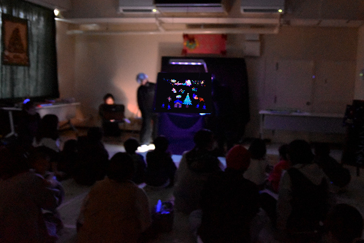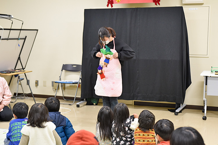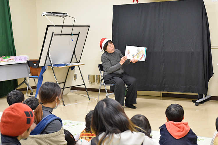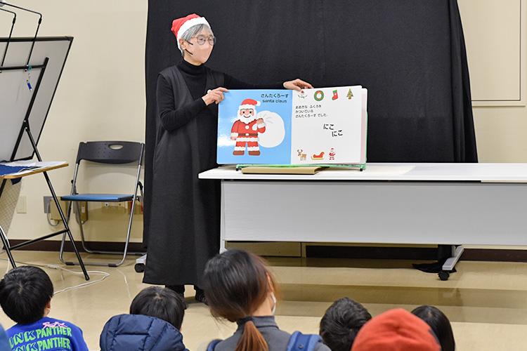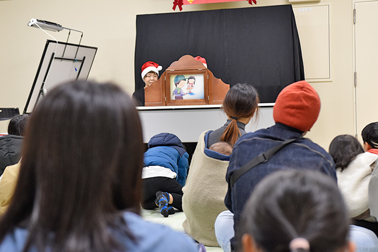 約30人の親子のみなさんにご参加いただき、クリスマスをテーマにしたボランティアさんによる、語りや絵本の読み聞かせ、紙芝居、手遊び、パネルシアターのほか、保育士さんによるエプロンシアターやリズムダンスで楽しい時間を過ごすことができました。