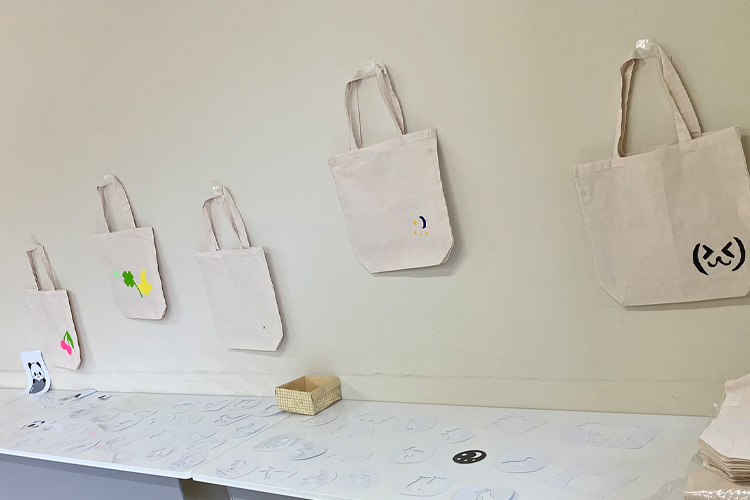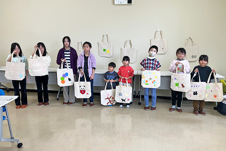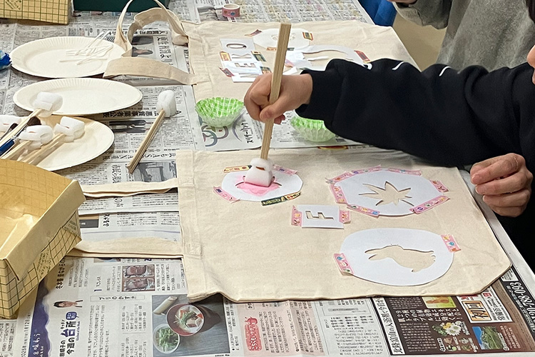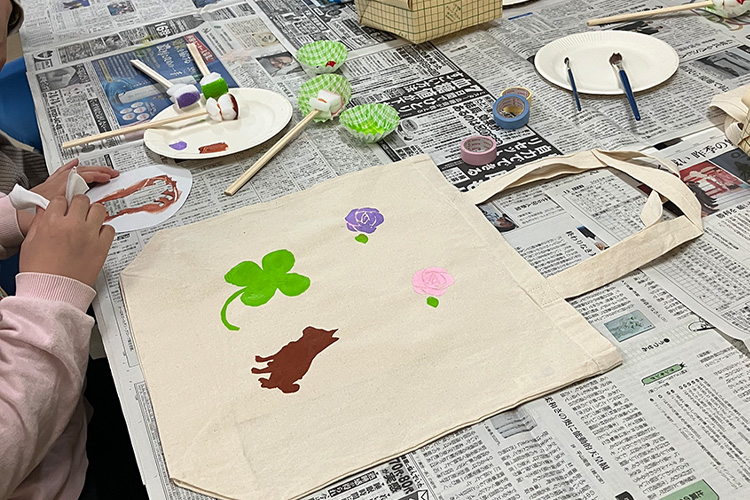 子どもたちは、好みの絵柄のステンシルシート(型紙)を選び、コットンバッグに貼り付けて、スポンジで色をのせる型染めに挑戦しました。色の組み合わせや配置を工夫しながら、世界にひとつだけのオリジナルトートバッグを完成させました。